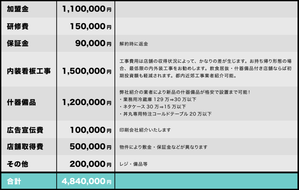 前者が合計124万円とFC加盟にしては破格なのと、店舗家賃の低額な狭小物件で運営できることからその取得費や内装工事費も他の店舗業態と比べれば低額で済むからです!